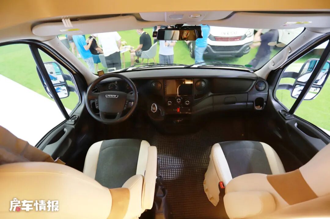 驾驶室内部还是延续了依维柯的设计风格,在动力上,这款房车搭载了一台3.0T的柴油发动机,匹配8AT变速箱,最大功率125kW,最大扭矩400N·m,满足最新的国六排放标准,平时持C本就可以驾驶。另外还配备了多功能方向盘和中控触控彩色大屏,也方便驾驶员后期操控。