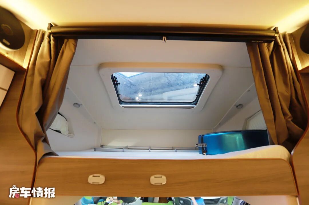 因为采用了大额头式的设计,所以在驾驶室上方的额头区域内还提供了一张双人床,尺寸约为2200mm*1400mm,加之三面环窗,所以采光度也比较不错,而且天儿好的时候还能开会窗户透透气,但前提是要在驻车的时候。