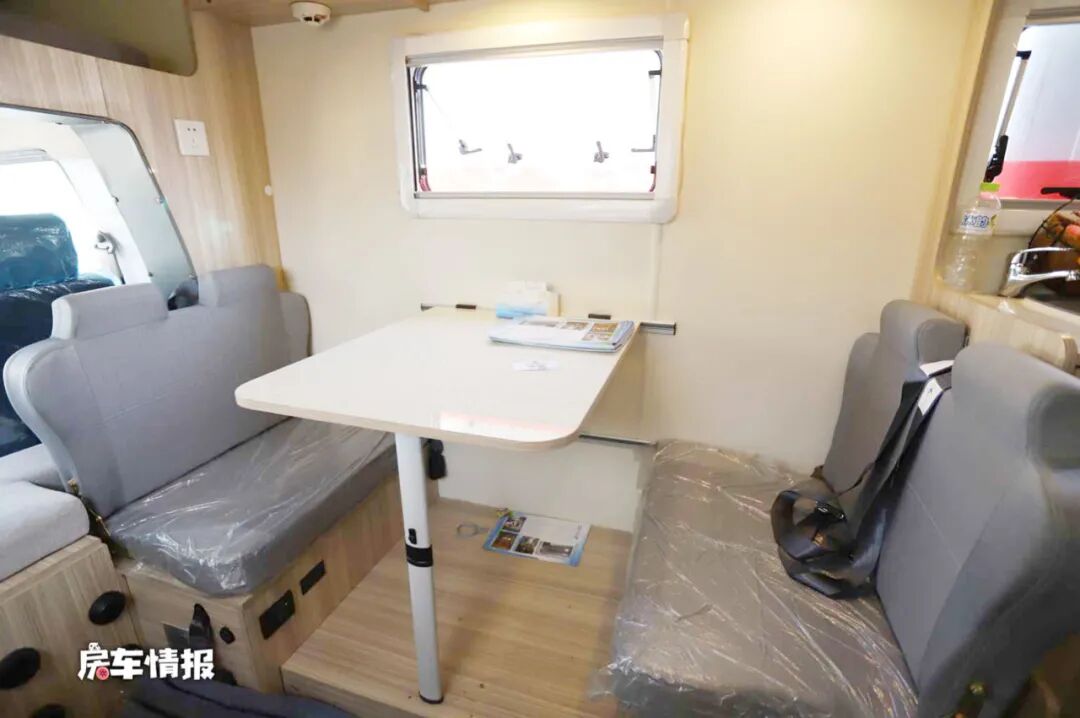 驾驶室后方提供了一圈L型的沙发座椅,下面还带有储物箱体,L型的沙发中间还包含了一个小型的会客区,两排对坐沙发和一张可升降的餐桌,晚上的时候L型沙发和卡座升降桌则可变成一张通铺,足够三个成年人休息使用。