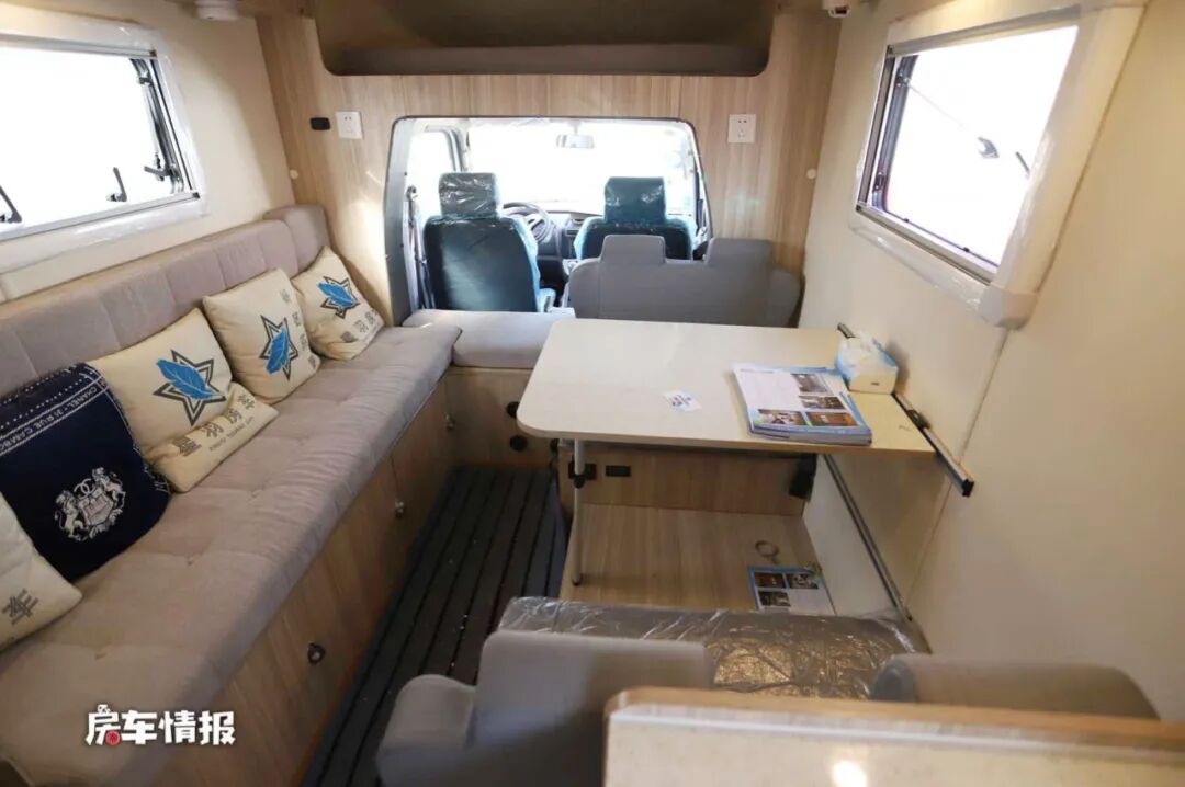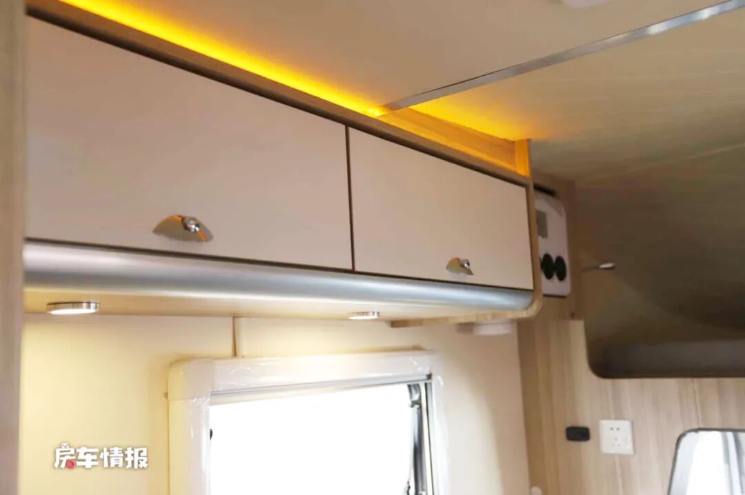 车厢内部采用了浅色木纹的家装风格,看起来非常的通透,虽然车身高度只有2550mm,但是也不显得压抑。