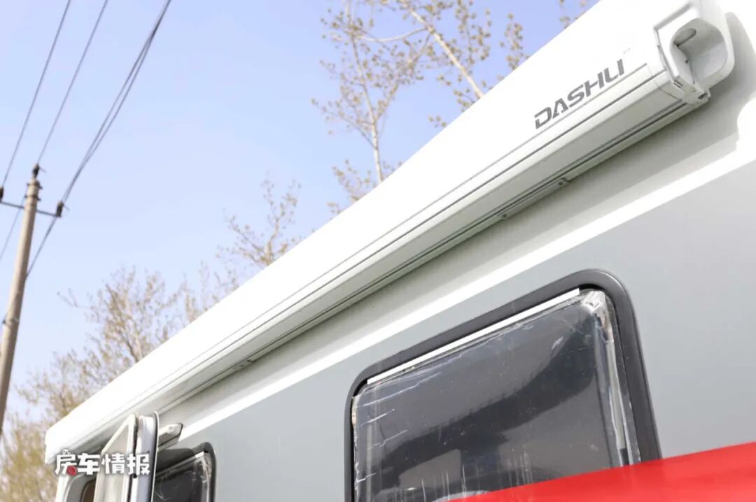 车厢采用三明治封闭式复合车身板结构,在车身的右侧上方提供了一个手动遮阳棚,并提供了外置淋浴花洒和外置抽拉灶台。