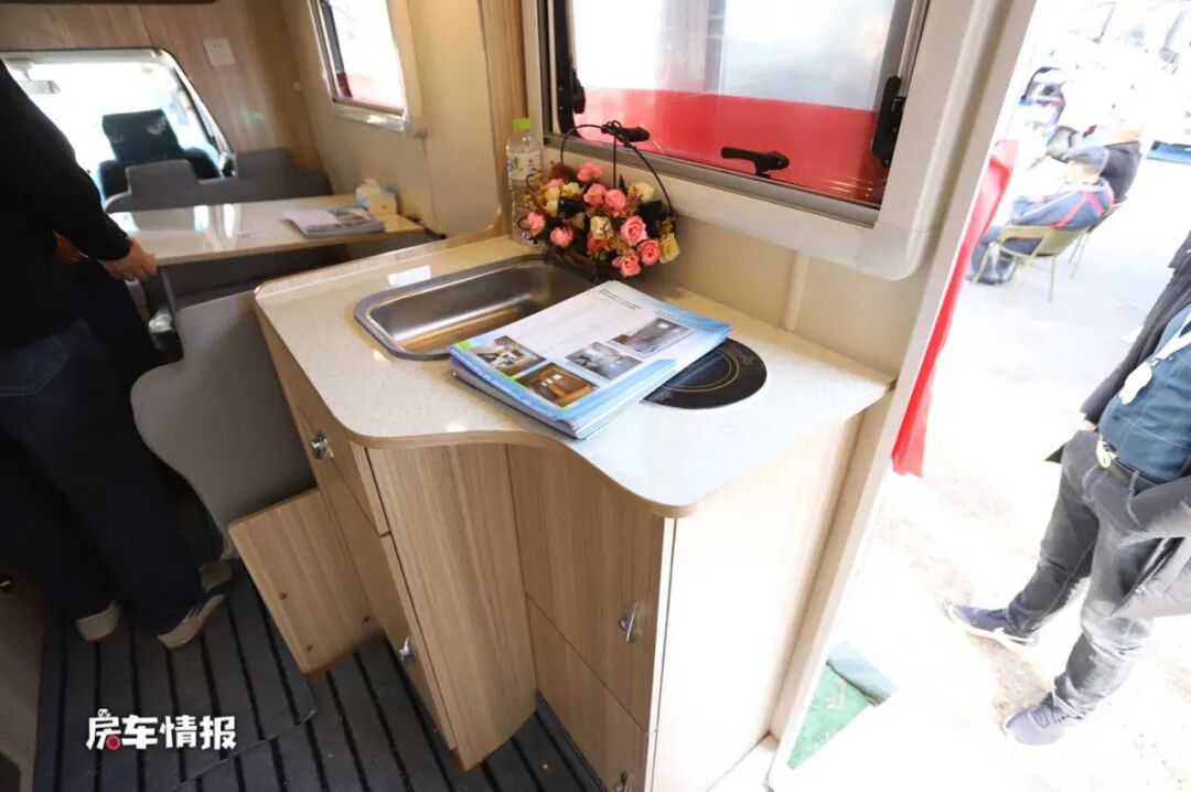 临近乘客门处是一个小型的厨房区,台面尺寸不是很大,但也提供了不锈钢的洗菜池和电磁炉,台面下方提供了微波炉和储物柜,平时做饭做菜的需求还是可以满足的。