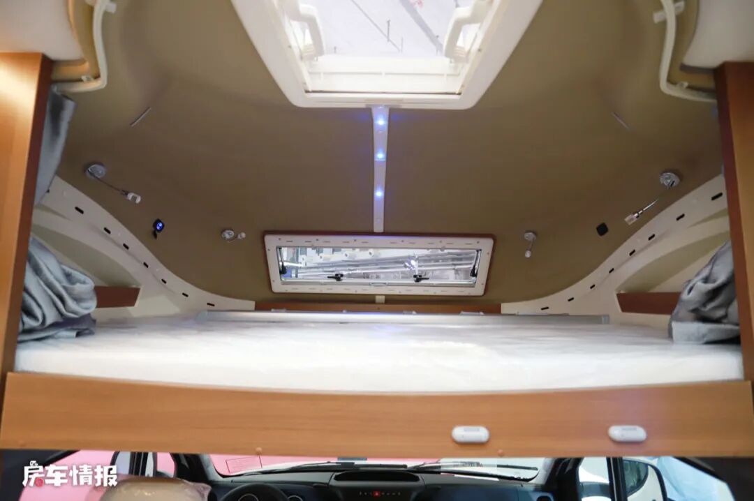 在驾驶室上方的额头区域内,提供了一张尺寸为2200mm*1350mm的额头双人床,也可以容纳两个成年人使用,额头床带有一个小型的天窗和换气扇,保证了进光量的同时也能够为此区域通风换气,同时周围还配有多盏小夜灯,方便夜晚的时候使用。