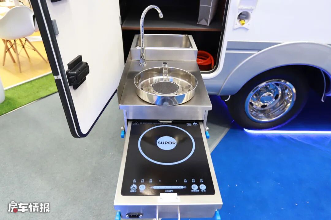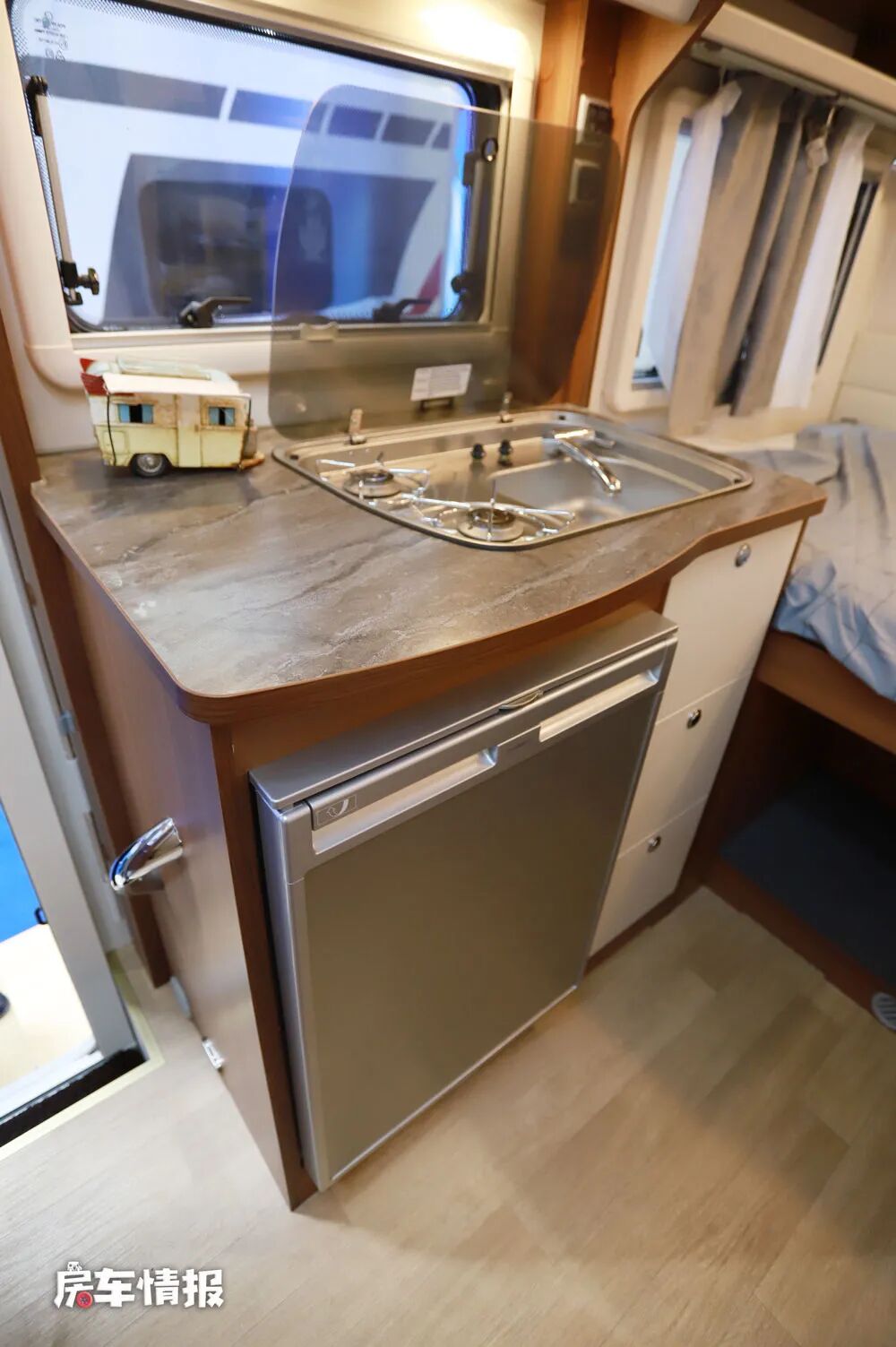 临近乘客门的后方是厨房操作台,台面上提供了带盖的不锈钢洗菜盆和双孔燃气灶,一体式的设计更加节省空间,同时下方提供了112L车载冰箱以及储物抽屉。