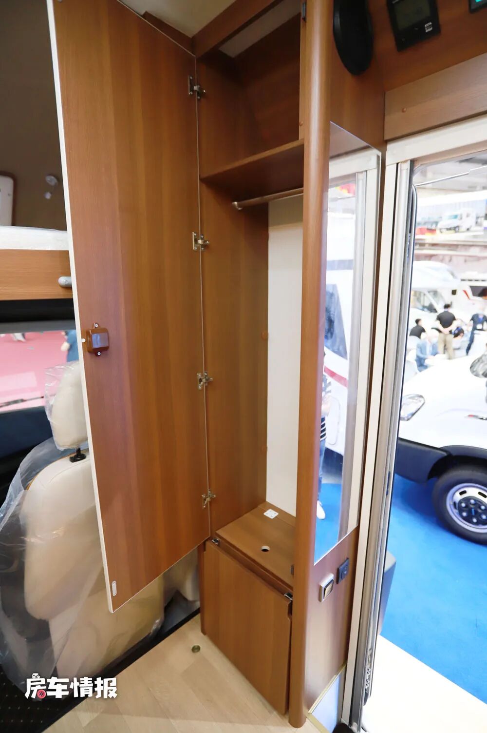 乘客门前方的小区域被打造成了衣柜,上下方都有隔断空间,可以放鞋子,侧面还配别了一面全身镜,方便女性朋友使用。