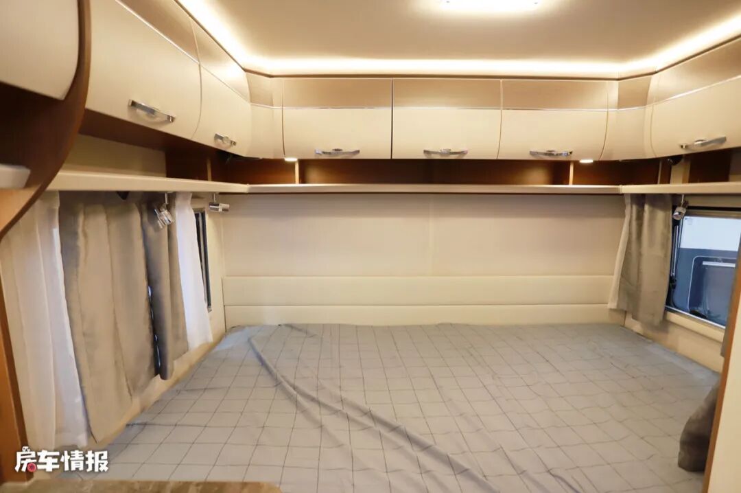 整个车尾部均为休息区,提升了整体的睡眠空间。横置尾床的尺寸可达2200mm*1500mm,完全可以容纳两个成年人,休息区顶部还带有一圈U型的储物吊柜,整车内部的储物空间还是比较充足的。