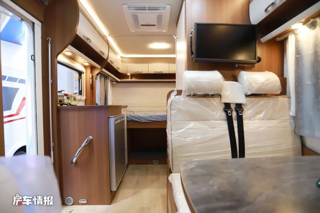 虽然是一辆C型房车,但是会客区却采用B型房车内部最常用的双人沙发座椅+长条餐桌的布局设计,虽然整体的空间逊色于四人对卡座,但是好在乘客座椅采用了全皮软包的材质,乘坐体验还是比较不错的。另外侧推窗上方还带有储物吊柜,存放一些平时常用的物品,拿取还是比较方便的。