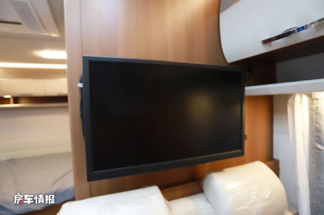 双人沙发后面的背板上配置了一台液晶电视,这台电视的角度必然不太适合坐在会客区观看,更多的时候大家可以选择在额头床上看。