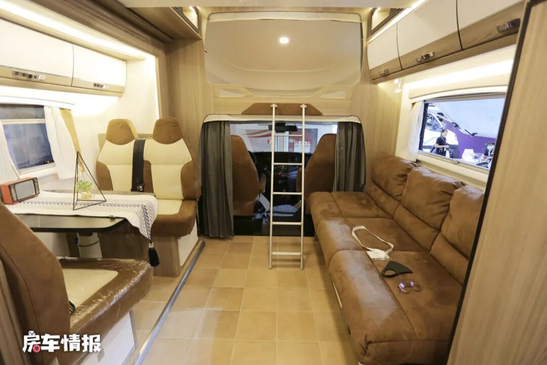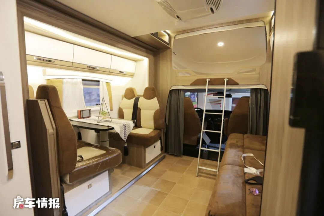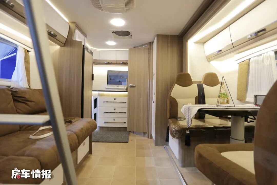 这款房车采用右后上门的方式,车内的布局也是单拓展中比较常见的设计方式,整体的配色方案比较偏向商务轻奢的风格。