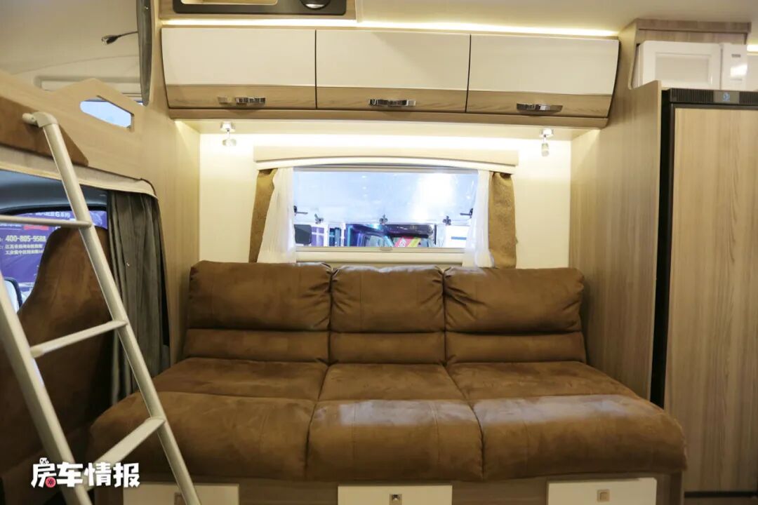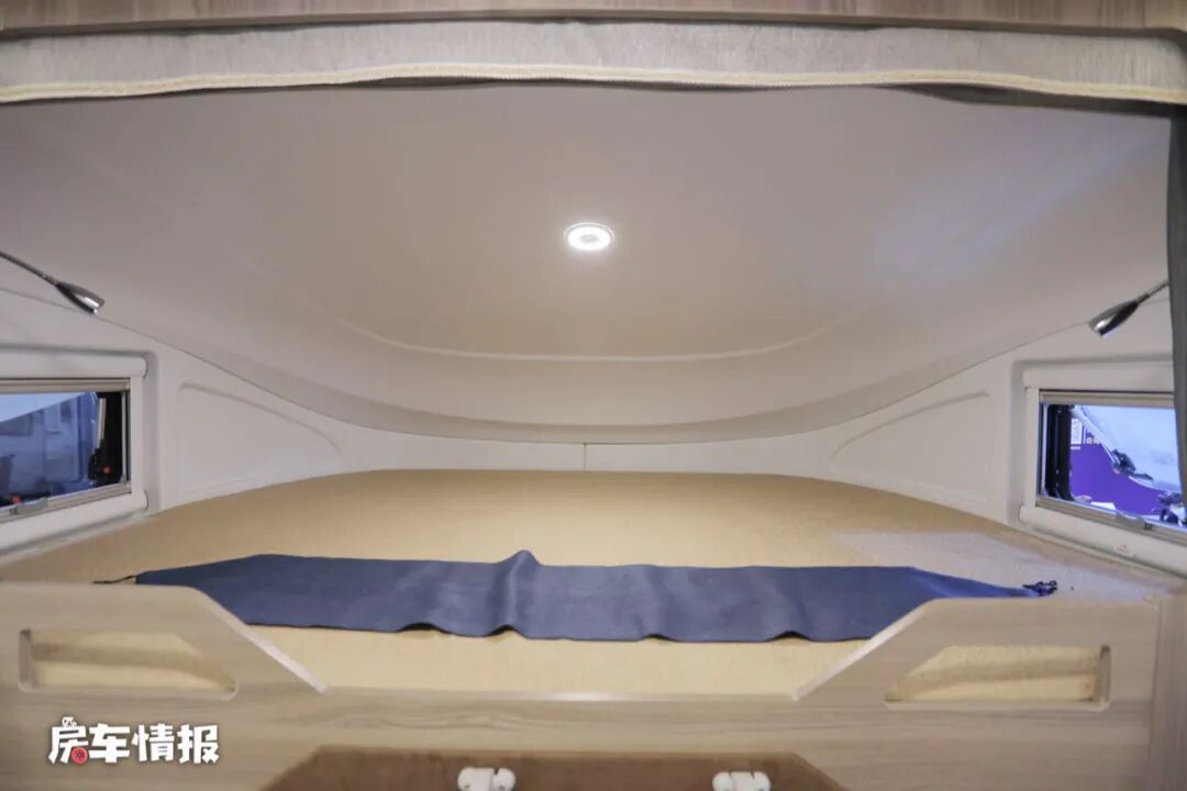 在驾驶室上方的额头区域内,还提供了一张双人额头床,也可以为两个成年人提供睡觉休息的地方,虽然额头区域没有大尺寸的天窗增加采光度,但是提供了一盏小顶灯,也可以保障这个区域的光亮度。另外额头床下方还提供了一台22寸的液晶电视,可满足在车内的休闲娱乐需求。
