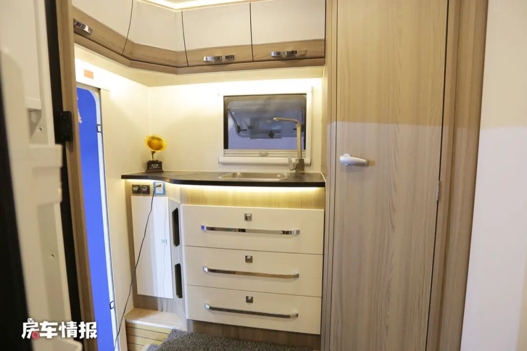 车尾部的厨房区设计的非常漂亮有质感,台面上的空间非常充足,提供了电磁炉和带盖的不锈钢水盆,上方提供了一圈L型的储物吊柜,提升了整车的储物空间,下方的储物抽屉空间也很充足,使用起来也比较的顺手。