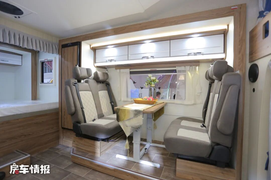 位于左侧拓展区域内的是全车的会客区,采用了最常规的四人对卡座+餐桌设计,采用了乘用车级别的座椅可以提升整体的乘坐体验,然而中间的餐桌并不是常见的升降餐桌,可是类似于我们在上学时使用的课桌,非常的有怀旧感,平时既可以在车内使用,也可以搬到车外使用。