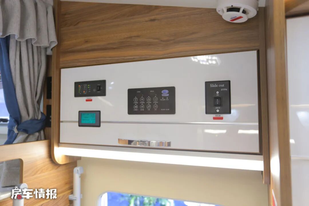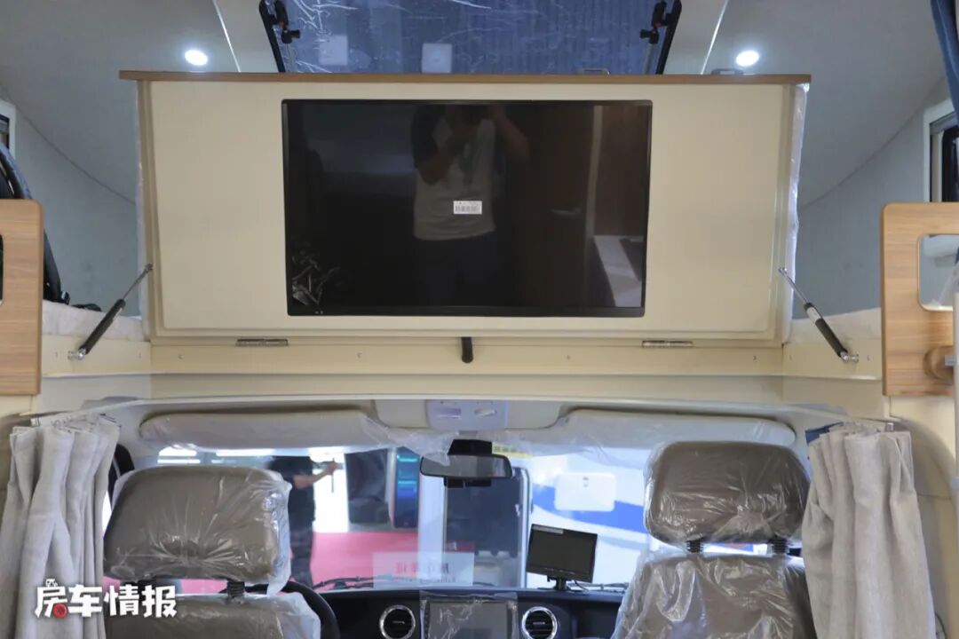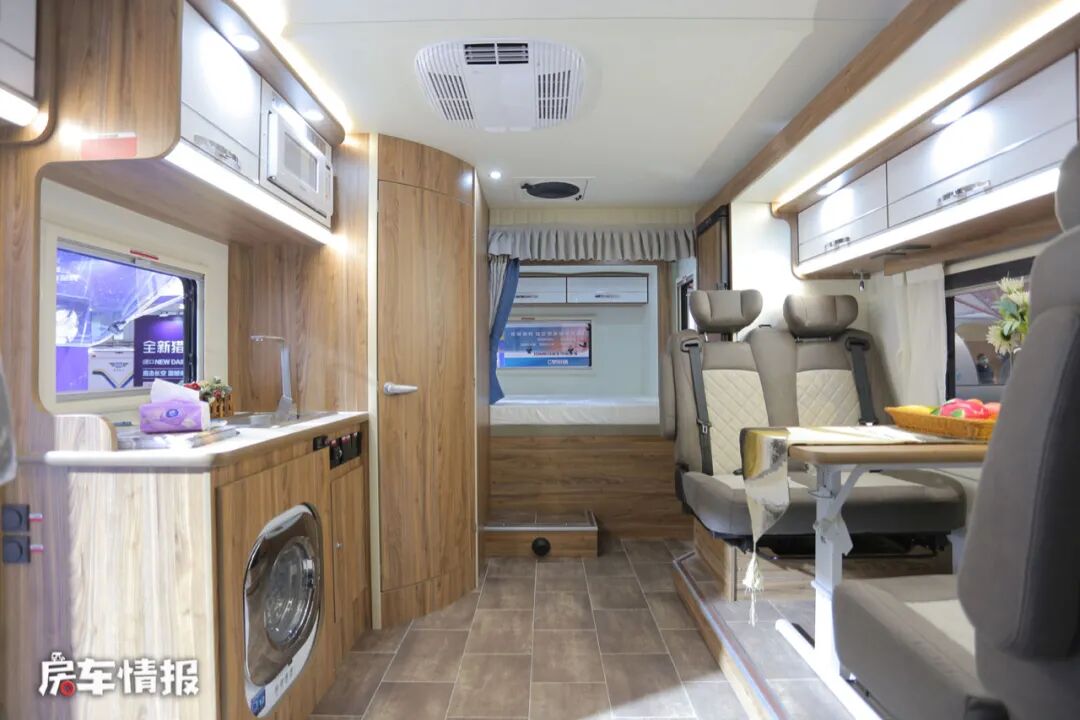 因为这款房车是一辆带有双拓展的房车,所以车内布局也采用了双拓展最流行的后置横床设计,车厢内部整体也比较偏商务风,原木色的家具也更加突显了整车的质感。