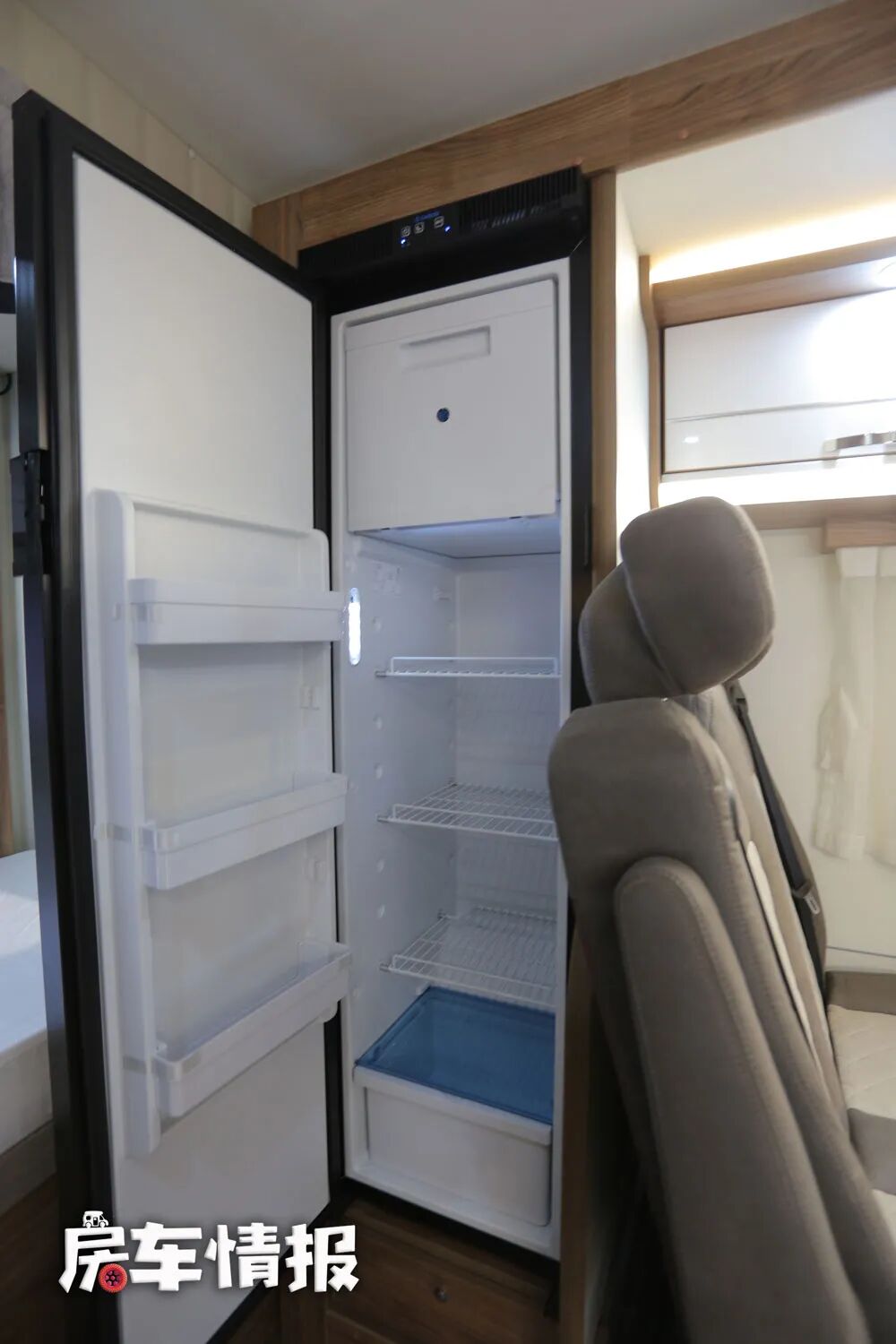 会客区顶部配备了三个储物吊柜,沙发后方则放置了一台大容积的冰箱,完全可以容纳长途旅行需要存放的食物。
