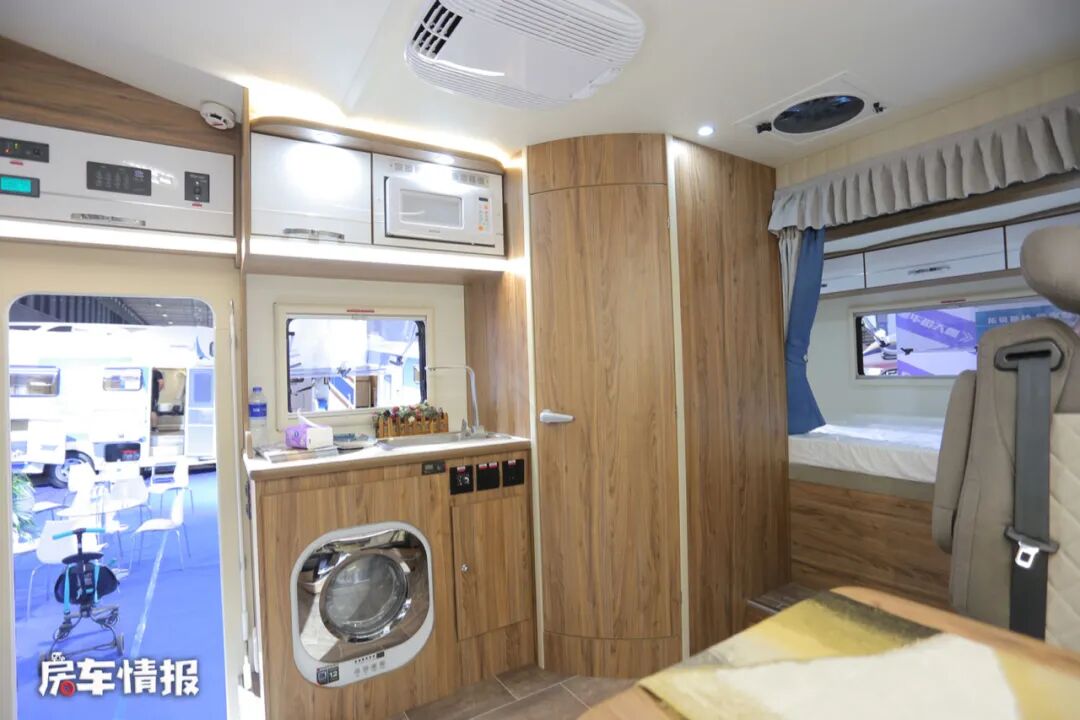 位于乘客门后方的厨卫区也是采用了一个常规的设计,橱柜台面上带有电磁炉和洗菜盆,上方配有一个微波炉,下方镶嵌了一台洗衣机,不过整体的储物空间并不是很充足。