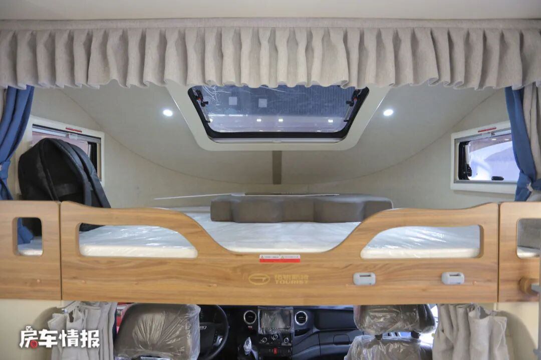 在最前方的驾驶室上方的额头区域内,带有一张三面环窗的额头双人床,尺寸为2200mm*1300mm,可以容纳两个成年人使用,不仅采光度通透,而且平时也可以打开窗户实现空气对流。