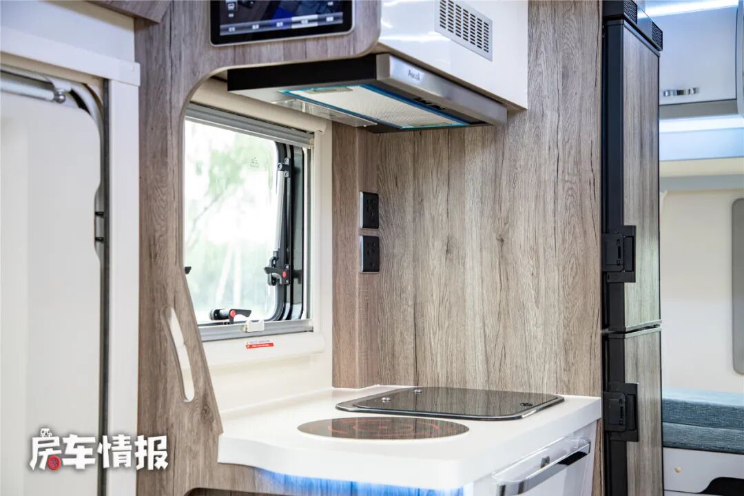 车厢中门后方则是车内的厨房区域,这里提供了抽油烟机、电磁炉、洗菜池以及一台185L房车专用冰箱,搭配车上300L清水箱和100L灰水箱,可以满足日常做饭洗漱之用。