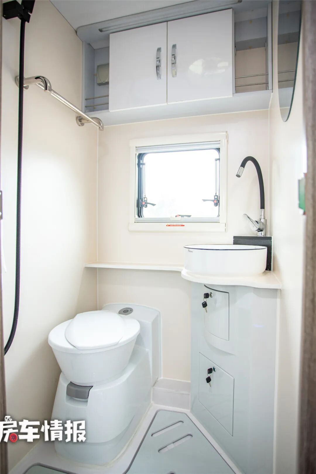 卫生间位于车厢中部,内部空间比较大,成年人里边也可以自由转身活动,设施方面提供了盒式马桶、独立淋浴花洒、洗手池、梳妆镜等。