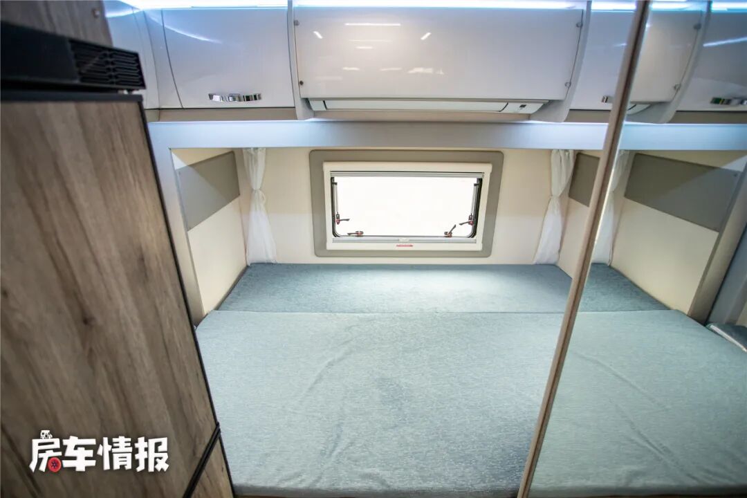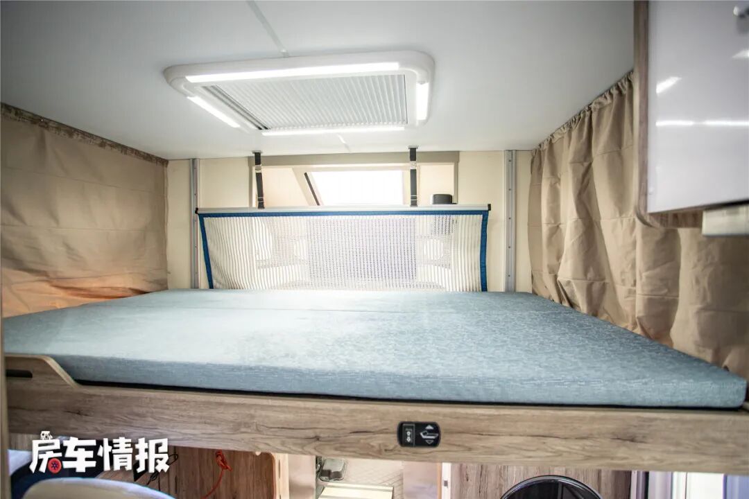 前边介绍过这款车是一款4座4卧的房车,车内还有另外一张双人床,被隐藏在生活区顶部,降下来以后,尺寸约为2000*1200mm,睡下2名小朋友完全没问题,内外侧还提供了网兜,防止跌落。