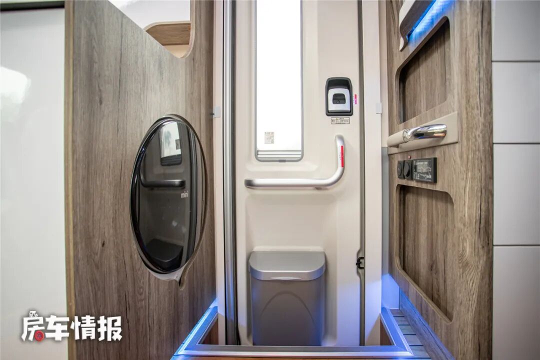 位于车厢中门一侧,则提供了一组储物柜,在驻车以后便于摆放一些随身物品,下方提供了一台带有烘干功能的大宇洗衣机。