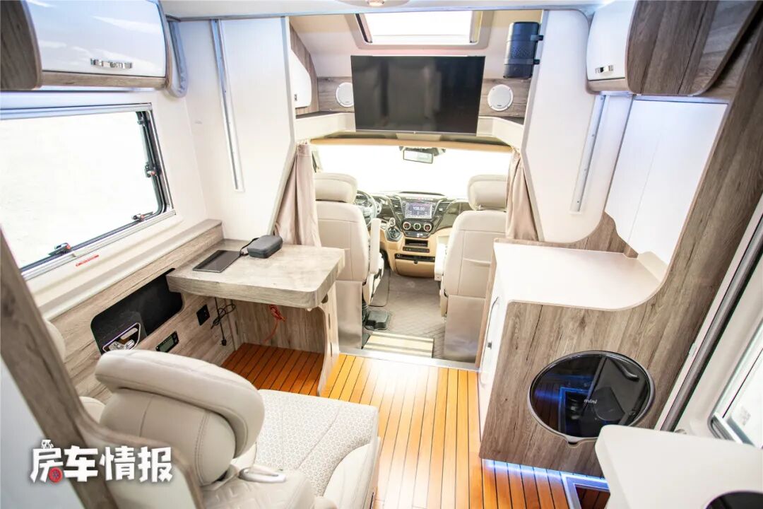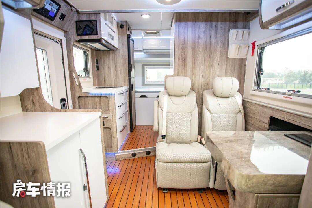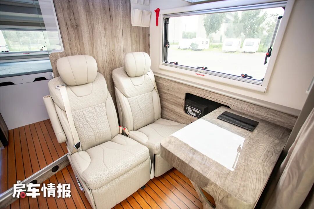 来到生活区,采用的是一组双人座椅+餐桌的布局方式,如此带来的好处就是后方乘客能够获得相当充裕的空间,搭配两张航空座椅,即便是长途乘坐依然非常舒适。