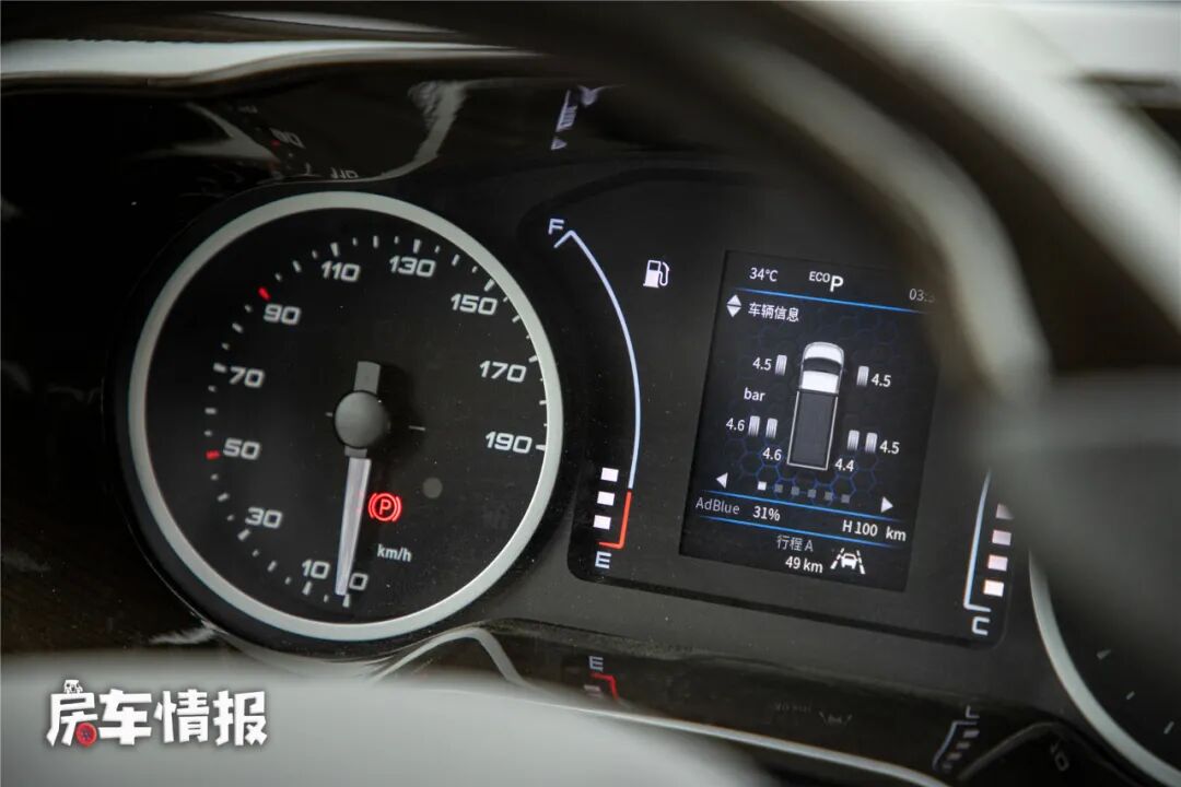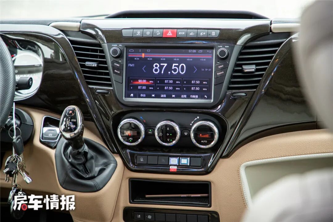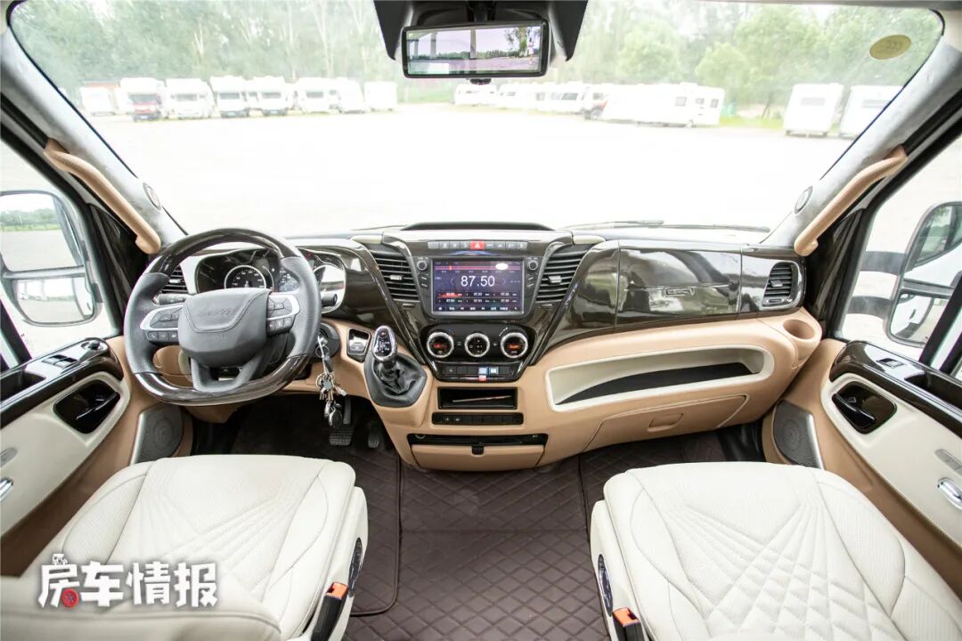 驾驶室的设计也和国产依维柯房车有一定区别,更加时尚的中控台搭配电子手刹、流媒体后视镜等,营造出了不错的豪华氛围,方向盘采用平底造型设计,营造出了一定的运动感。