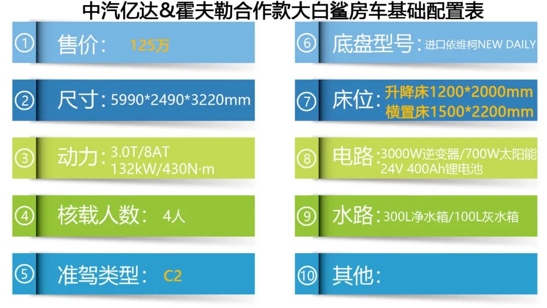 总的来说这款中汽亿达霍夫勒合作款大白鲨房车,整车外观非常酷炫,带有浓浓的硬汉气息,开着旅行心里倍儿踏实~在售价方面,这款新车指导价125万,对于这样一款基于进口依维柯底盘打造、四座四卧的越野风格房车,大家觉得怎么样呢?