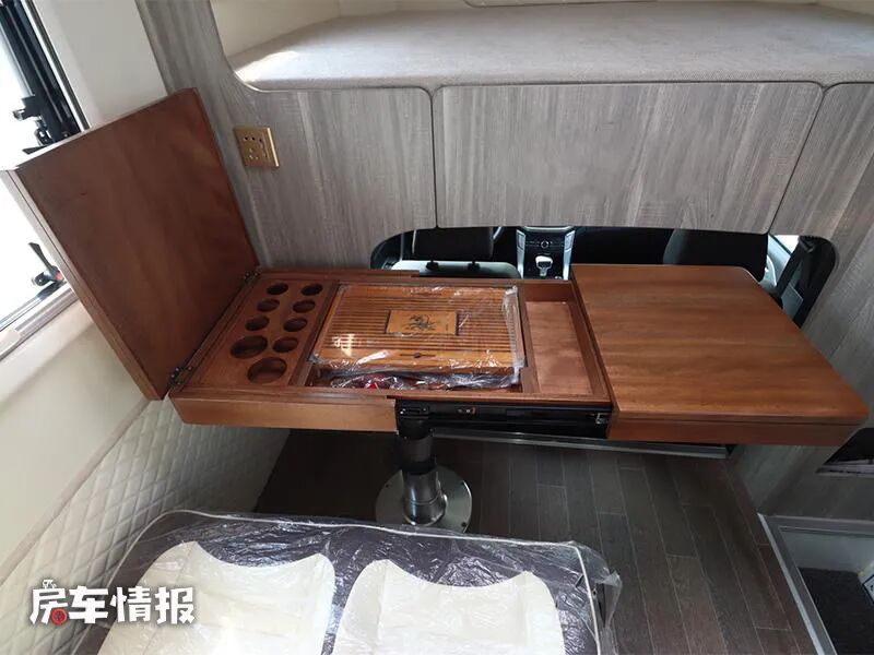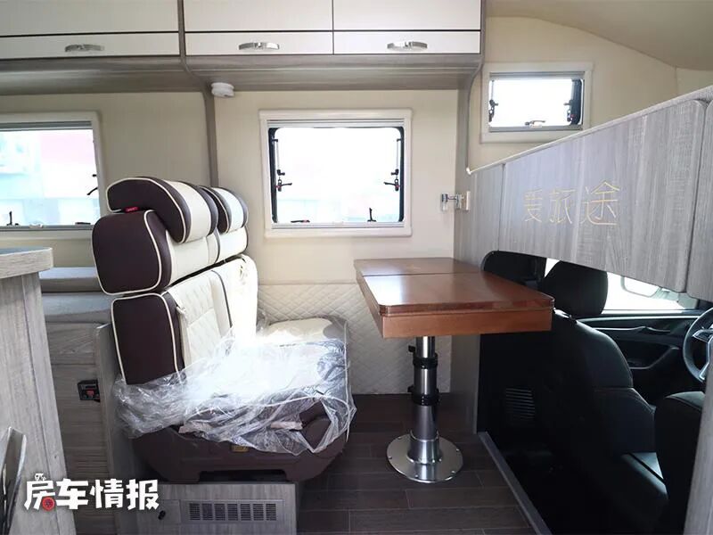 全车的会客区并不是采用四人对卡座的形式,而是采用了B型房车中常见的双人沙发+升降餐桌的设计,所以整车在行驶过程中只能乘坐四个人。