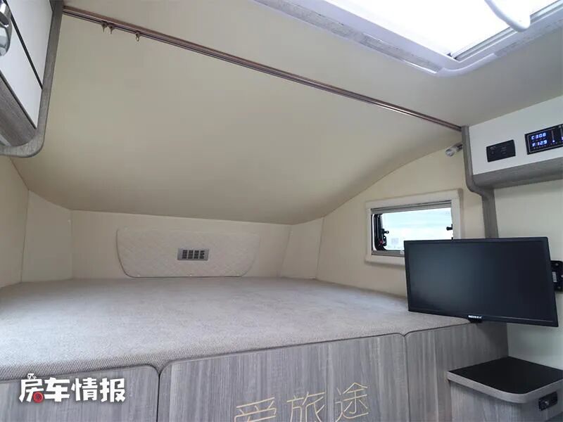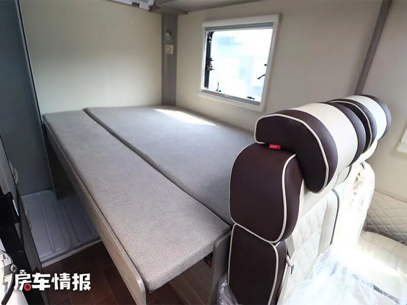 驾驶室上方的大额头区内带有一张1900mm*1300mm的双人额头床,足够两个成年人在这里睡觉使用,两侧还带有小型的外推窗,可以保证此区域的采光度以及通风。