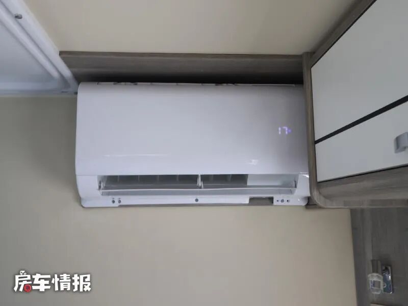 床尾处顶部还配置了一台家用变频空调,使用起来更加便捷,同时侧面还提供了一排储物吊柜,可以存放一些平时换洗的衣物。