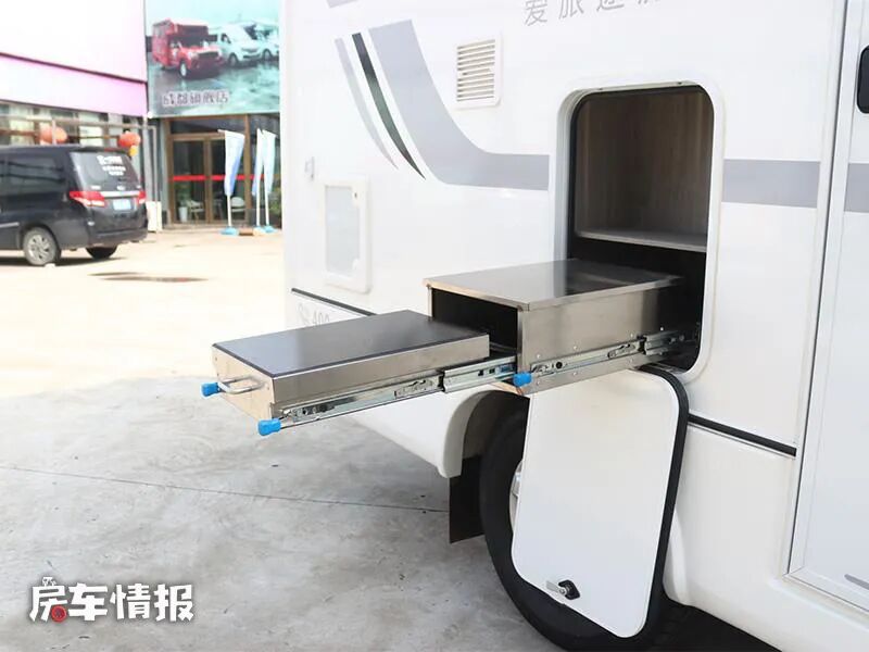 车身外观采用大量的白色调,搭配灰黑色花纹,简单又低调。同时车身外部也匹配了一些户外设施,例如遮阳棚、储物舱、外置厨房、水电接驳口等,满足在车外使用的需求。