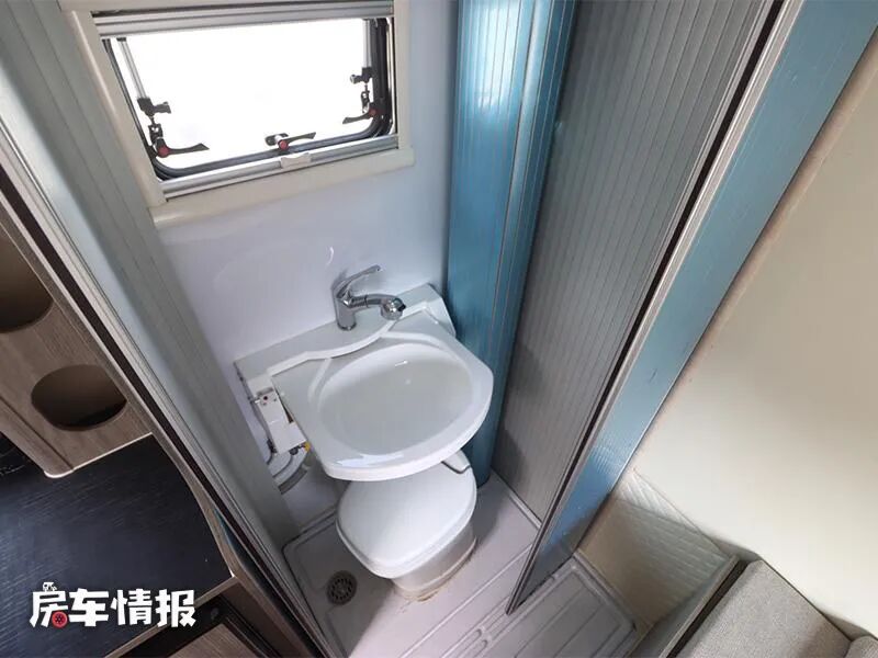 最后是尾床对面的独立卫浴室,采用的是卷帘门的开合方式,空间使用起来更加灵活,虽然卫浴室内部的空间非常有限,但还是装配了洗手台、淋浴花洒、马桶等基本的洗漱设施,满足平日所需。