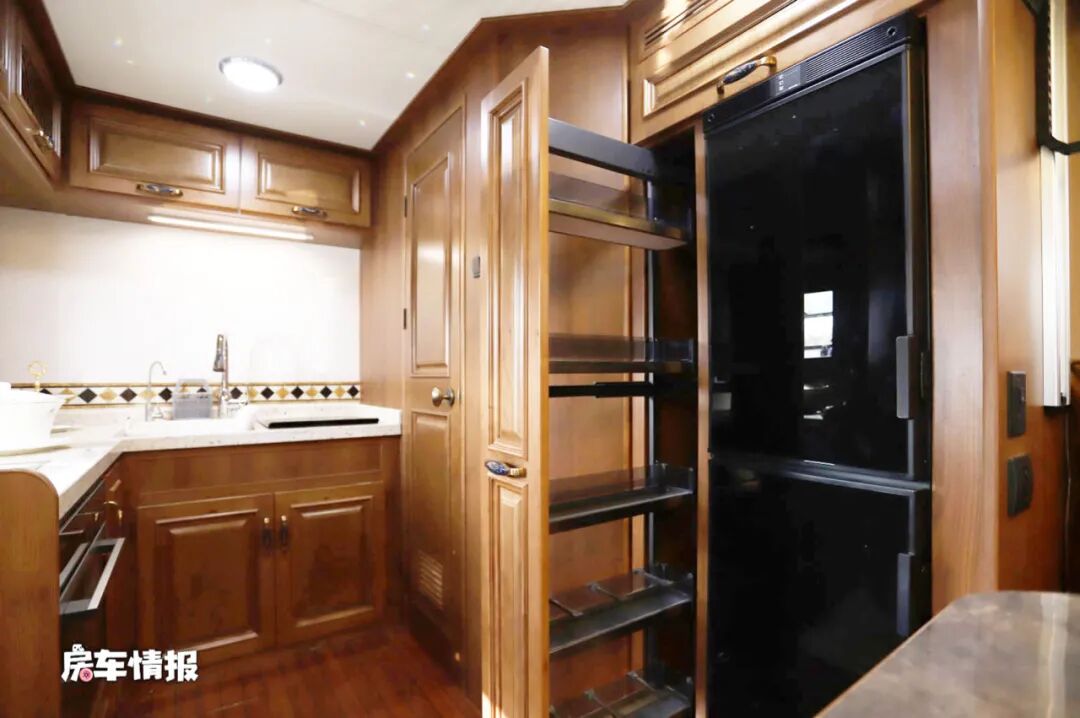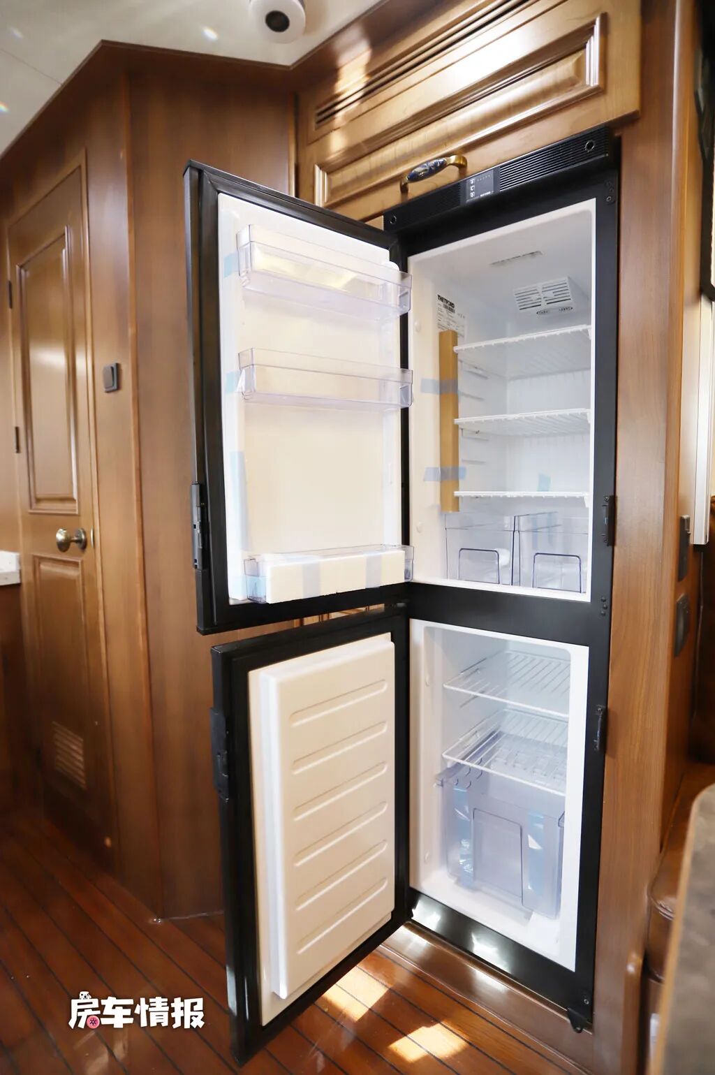 会客区的后方是一台150L亮黑色的双开门冰箱,平时存放食物足够用,冰箱旁边还提供了一个夹缝抽拉置物架,平时可以放一些瓶瓶罐罐,也不用担心行车时会倒塌。