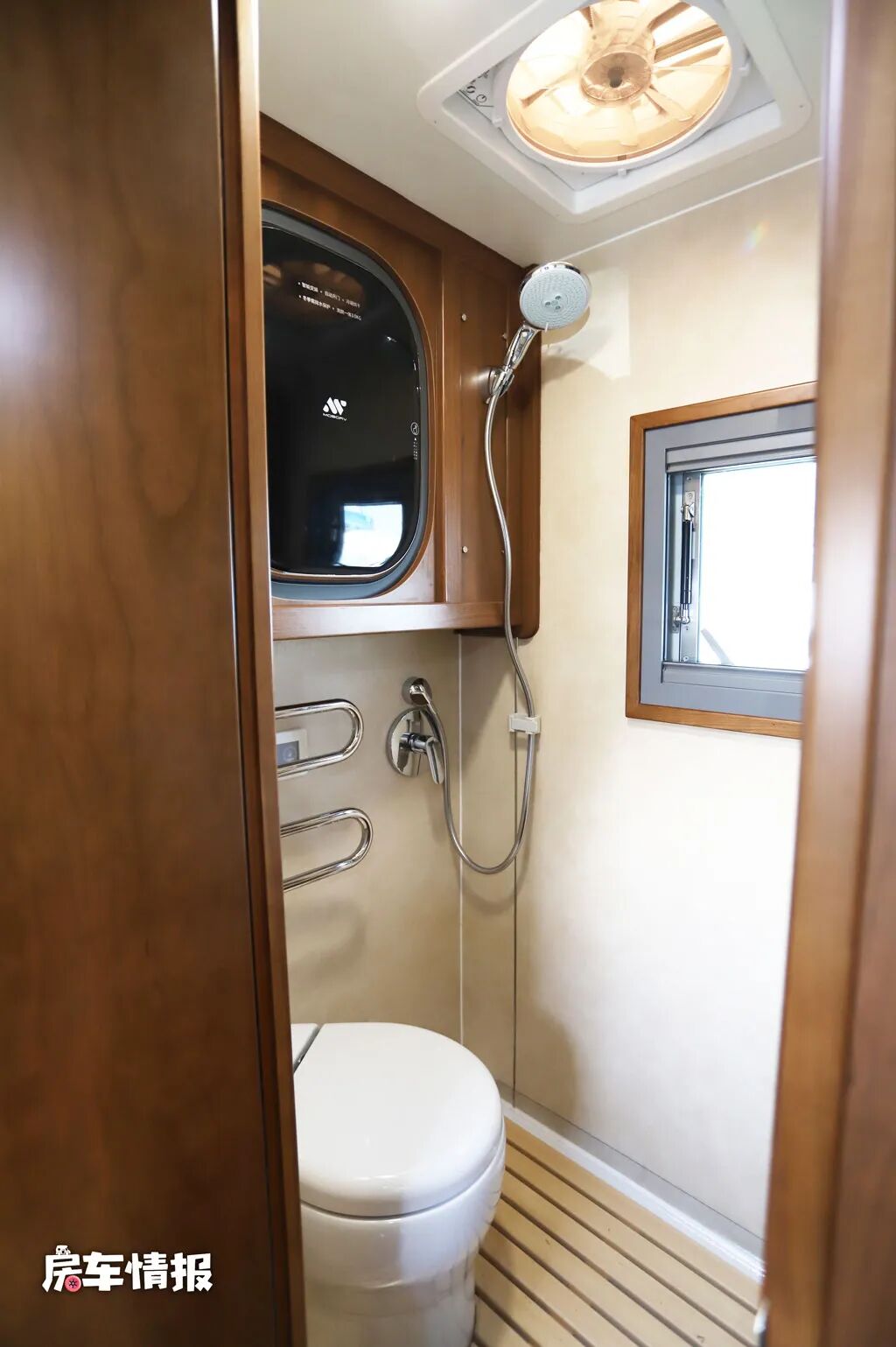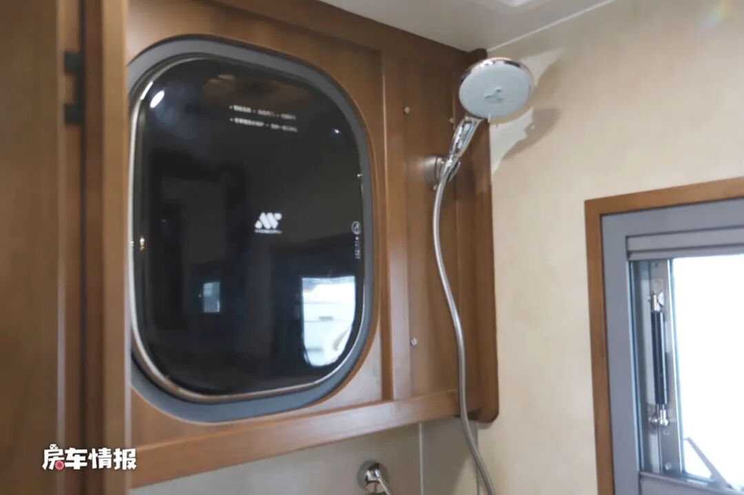 冰箱旁边是一间单独的卫浴室,采用了木质单开门设计,内含了马桶、烘洗一体的全自动洗衣机、淋浴花洒、盥洗台,配备十分齐全,而且空间也还不错,完全能够满足出行的洗漱需求。