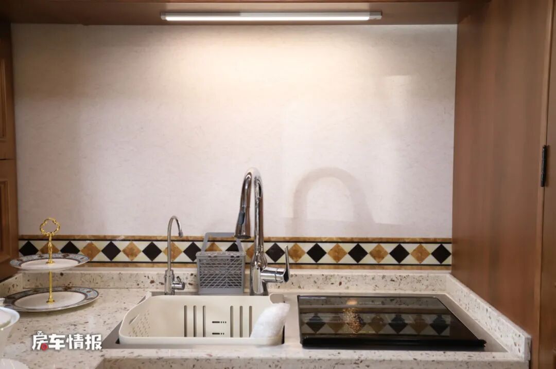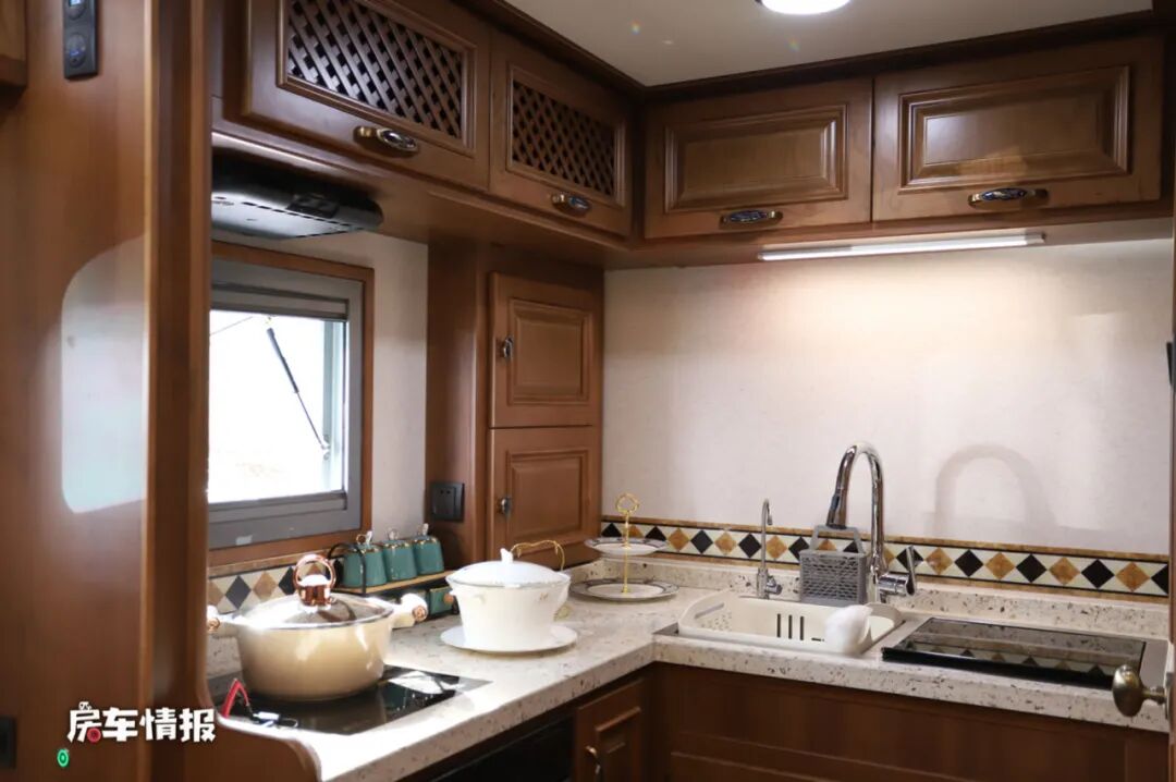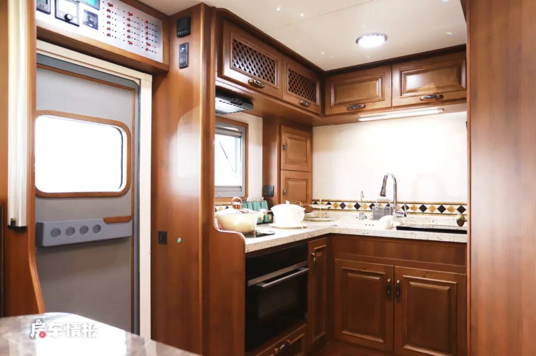 车厢的尾部是全车的厨房区,空间非常的宽敞,台面采用L型的设计,设施配置的相当高级和齐全,包括集微波、蒸、烤三位一体机、全自动水槽洗碗机、抽油烟机、净水机、电陶炉以及厨具和橱柜。