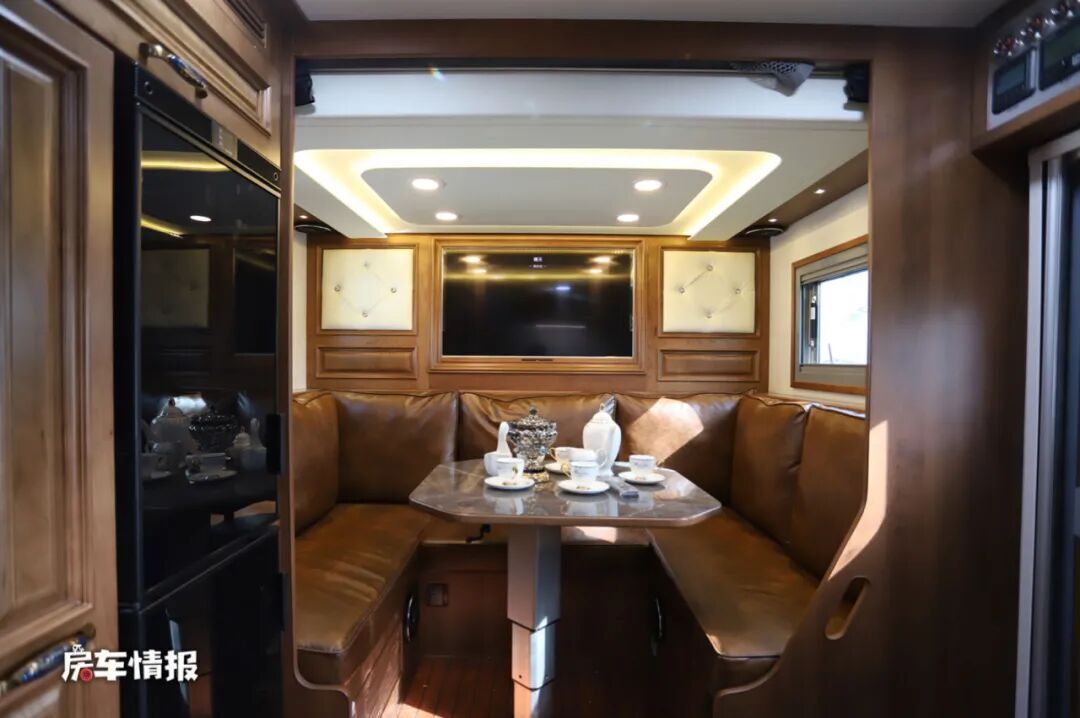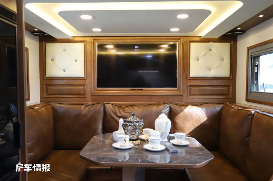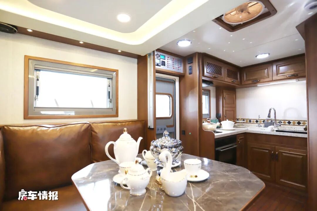 车厢内部采用美式复古设计,胡桃木色的家具配色彰显了豪华感,地板全部采用的是船用柚木地板,并安装了水箱加热板和地板加热板。