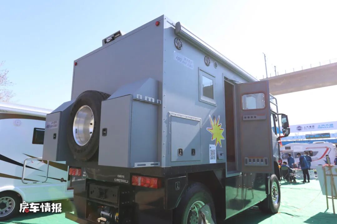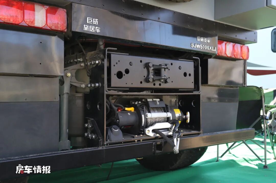 在车身外部还提供了外置抽拉灶具和水盆,车厢尾部还加挂了两个储物箱。除此之外,车后的拖钩采用标准方口后拖钩,用于拖挂后车,并提供了18000磅的电动绞盘。