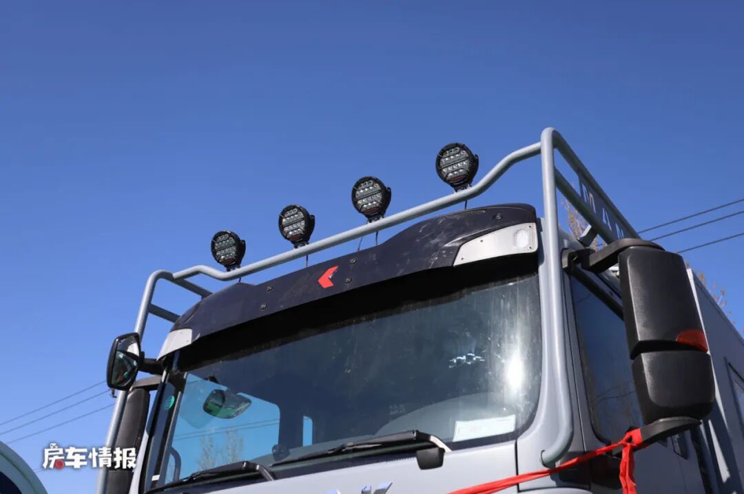 在车前顶部还提供了4个圆形越野探照灯,侧面提供了爬梯,车身右侧上方提供了一个电动的的遮阳棚,带有风感功能可自动收回。另外遮阳棚上侧还带有灯带,方便夜晚使用。