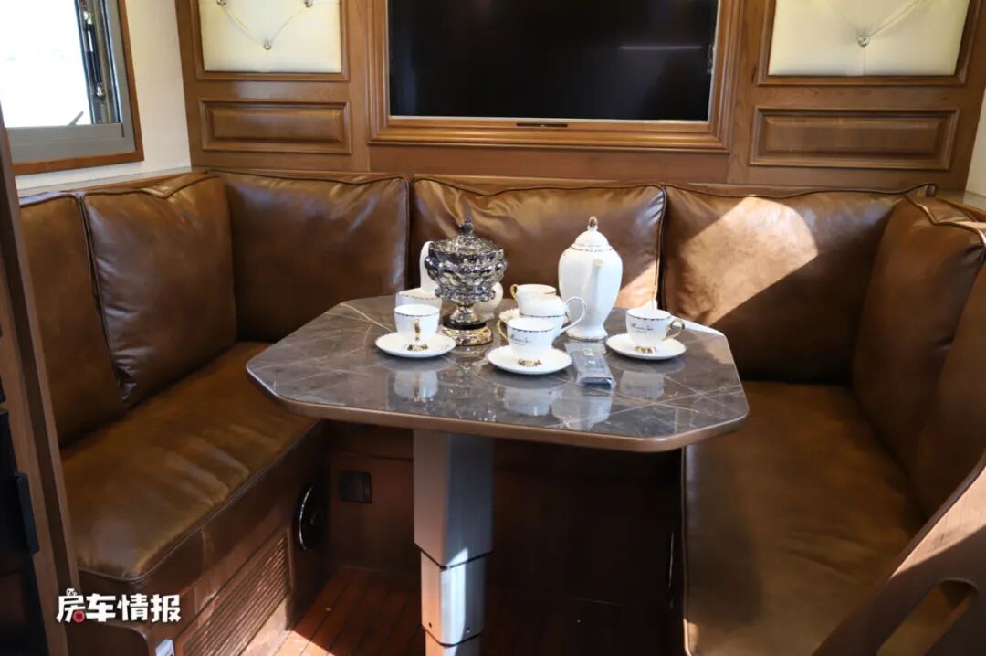 最前侧是全车的会客区,提供了一圈U型的皮质软包沙发,沙发的舒适度堪比家中的沙发,内部为乳胶材质,中间配备了一个电动升降桌,非常的高级。