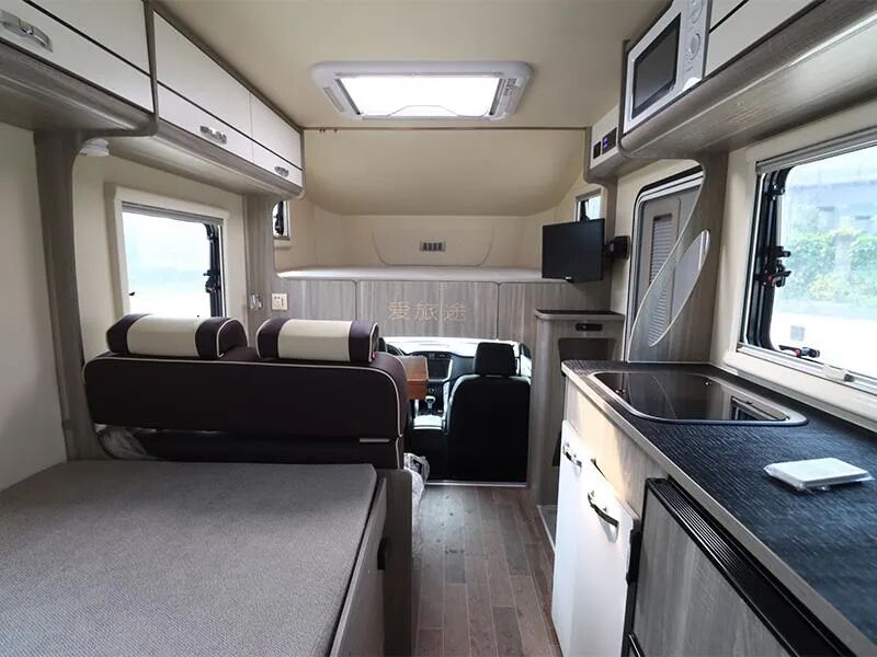 房车专用冰箱、微波炉、翻盖式水槽等完备的厨房配置以及超大的厨房台面,让你随时随地享受烹饪的快乐。