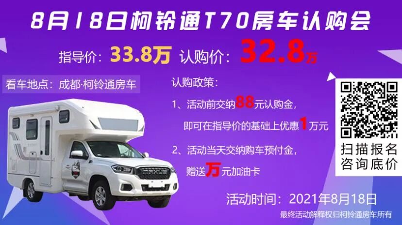 2021年8月18日柯铃通T70皮卡房车将邀请新老车友参加新品试驾会!提前报名预约可享万元优惠及万元加油卡等重磅礼品。