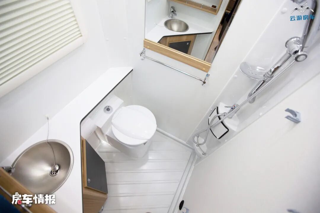 全车采用了干湿一体式的卫生间设计,内部提供了马桶、洗手台、淋浴花洒、换气扇和梳妆镜等,也可以满足出行的洗漱需求。