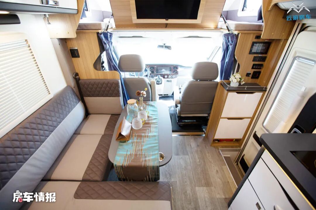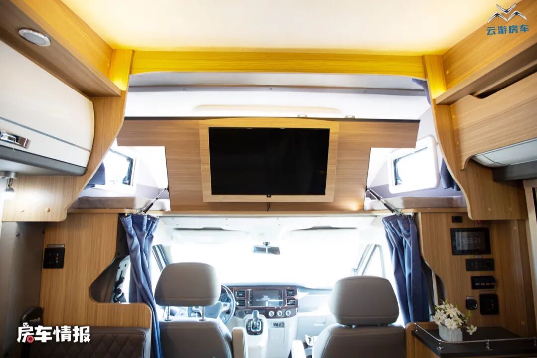 除此之外,在前方的大额头区域内还提供了一张尺寸为2150*1400mm的双人额头床,额头床三面环窗,通透性非常好,另外在床板下方还带有一台32寸的液晶电视,满足平时的娱乐需求。