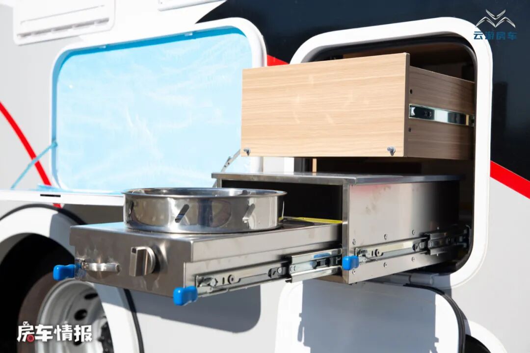 整车的车厢区分于车头使用了非常有质感的灰色,外部也配置了相当丰富的生活设施,包括遮阳棚、外置翻板、外置厨房、储物空间和水电接驳口等,方便平时在车外进行烹饪。另外车尾部还带有倒车雷达和倒车影像,提升整体的安全系数。