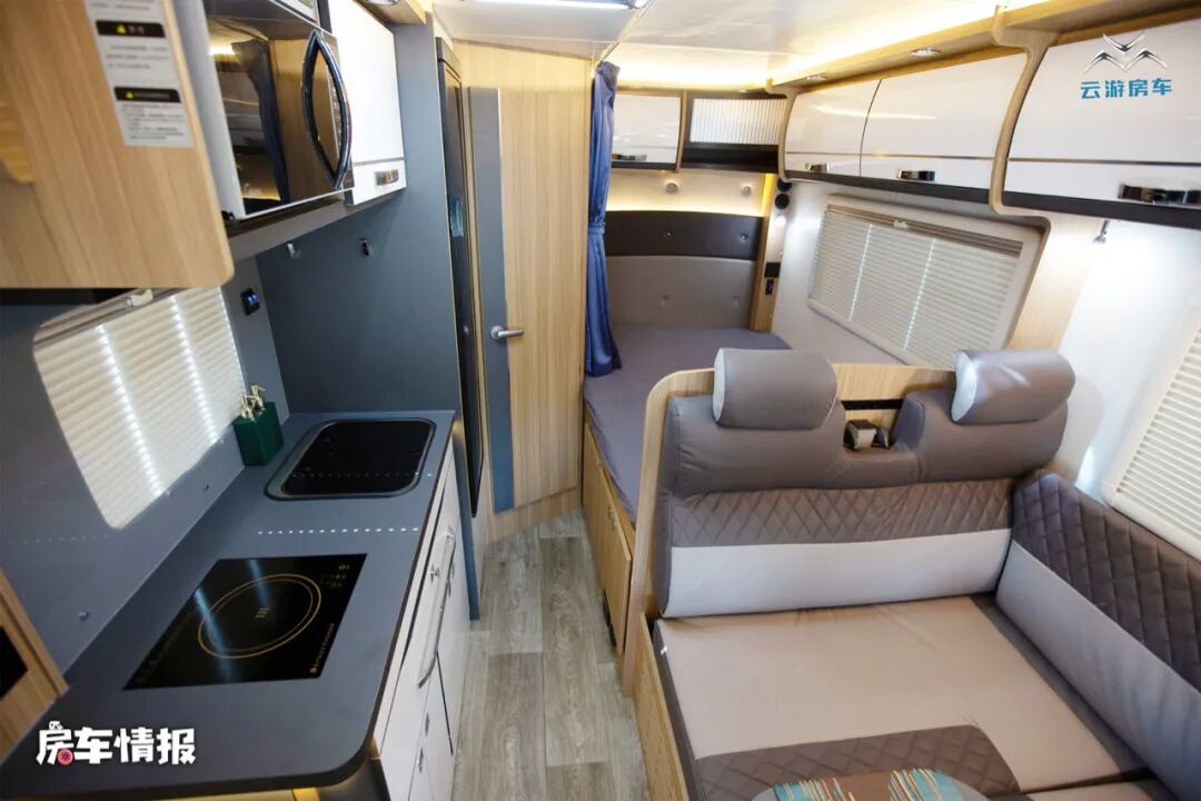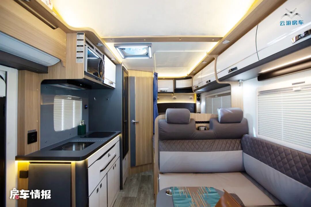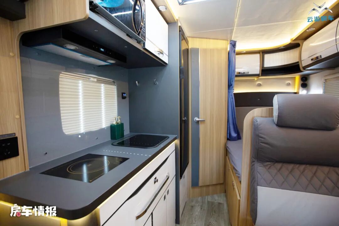 乘客门后方的厨房操作台面积还是挺宽敞的,台面上不仅提供了电磁炉和不锈钢的水槽,侧面还带有可拓展的小桌板,上方还镶嵌了一台微波炉,同时还提供了多个储物空间,足够平时放置烹饪工具。厨房区后方则是一台150L的冰箱,容量还是很大的,可以满足一家人的储物需求。