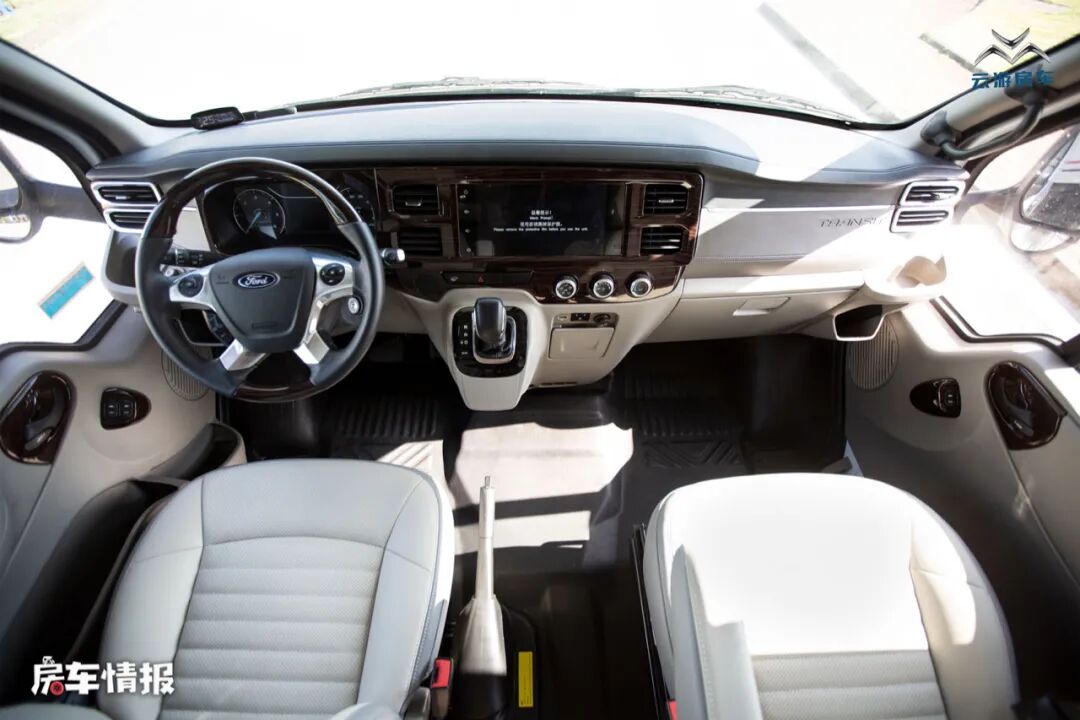驾驶室内部看起来比依维柯车型的要更加轿车化一些,中控台也加入了胡桃木色的配饰,非常的精致,同时也提供了多功能方向盘和中控彩色大屏,带有手机互联和GPS导航等功能,方便驾驶员后期操控。