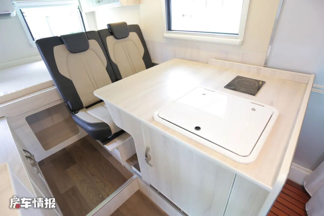 车内的会客区同样采用了双人沙发座椅+餐桌的形式,只不过和普通我们常见的餐桌不一样的是,这张餐桌同时兼顾了厨房操作台的功能,上方配置了电磁炉和水盆,备菜做饭炒菜吃饭全部在一张桌子上就行能搞定。