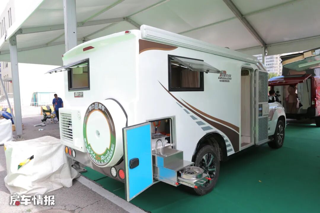 车身外部的生活配置相对简单,包括了右侧上方的遮阳棚、右侧后方的抽拉式外置厨房,,以及车尾部的外置备胎和空间外机,简约的同时保留了箱体的完整性。