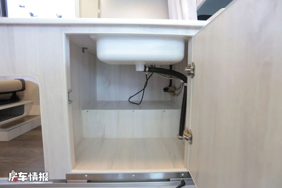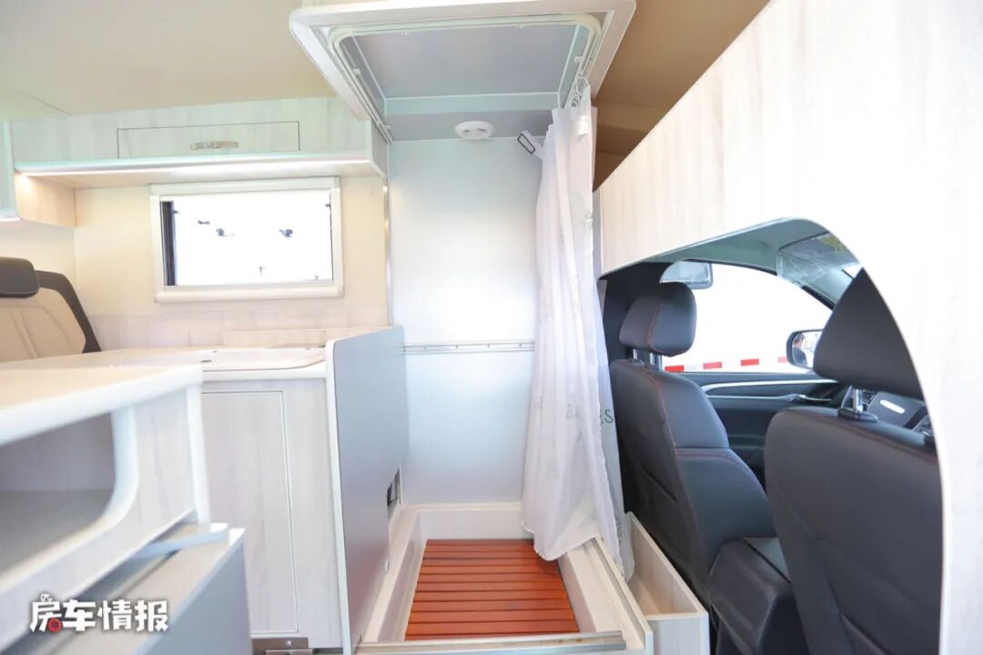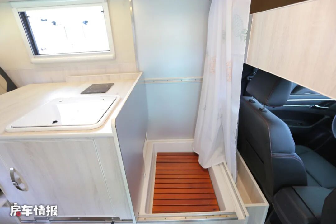 结合顶部的淋浴拉帘和花洒,简单的冲个凉还是可以解决的,如果想方便的话,可以随车放置一台便携式马桶,也免去了为找不到厕所而着急尴尬的场面。另外这款房车除了软帘的卫浴室之外,也提供硬质格挡的卫浴室,使用方法基本相同,不同的是将淋浴拉帘换成了木质板材,保温防偷窥功能更佳。