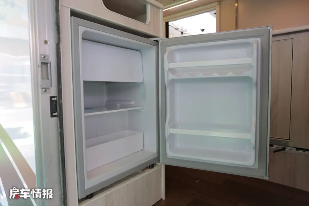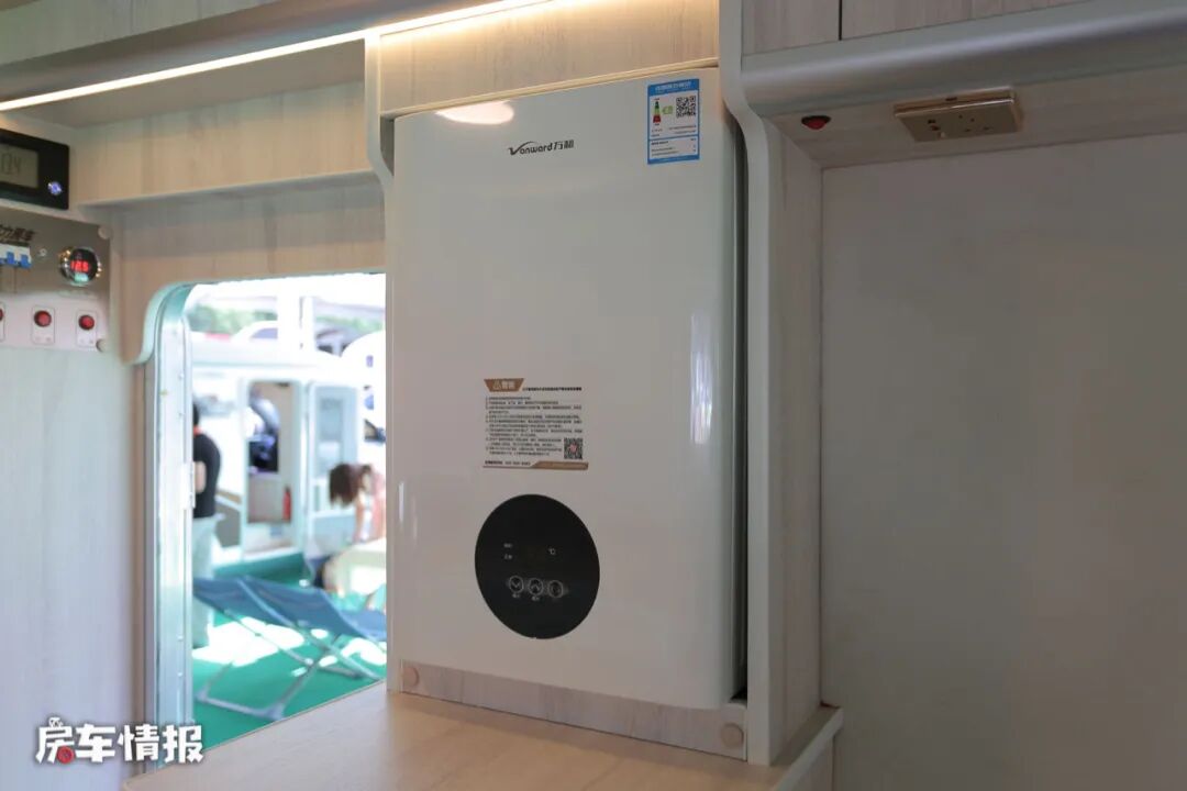 会客区相对的是一张空置的桌子,侧面带有一台车载冰箱,容量并不是很大,上方则安装了一台热水器,可以为全车提供热水的使用需求。